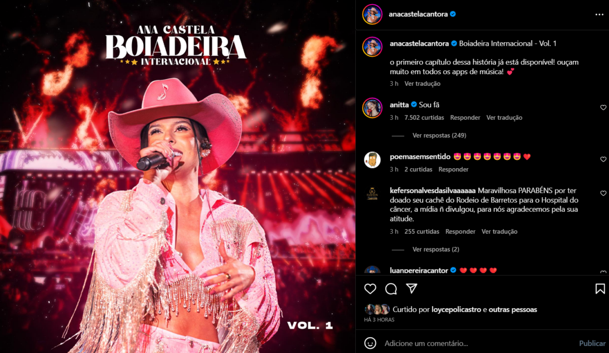 Enquanto isso, Ana Castela vibrou e pareceu muito feliz com o comentário de Anitta. A jovem sertaneja chegou a gravar um story, no Instagram, falando sobre o assunto. “Anitta, não faz isso comigo, eu estou na escada, Anitta“, brincou a “boiadeira”, enquanto descia umas escadas e se jogava nos degraus.