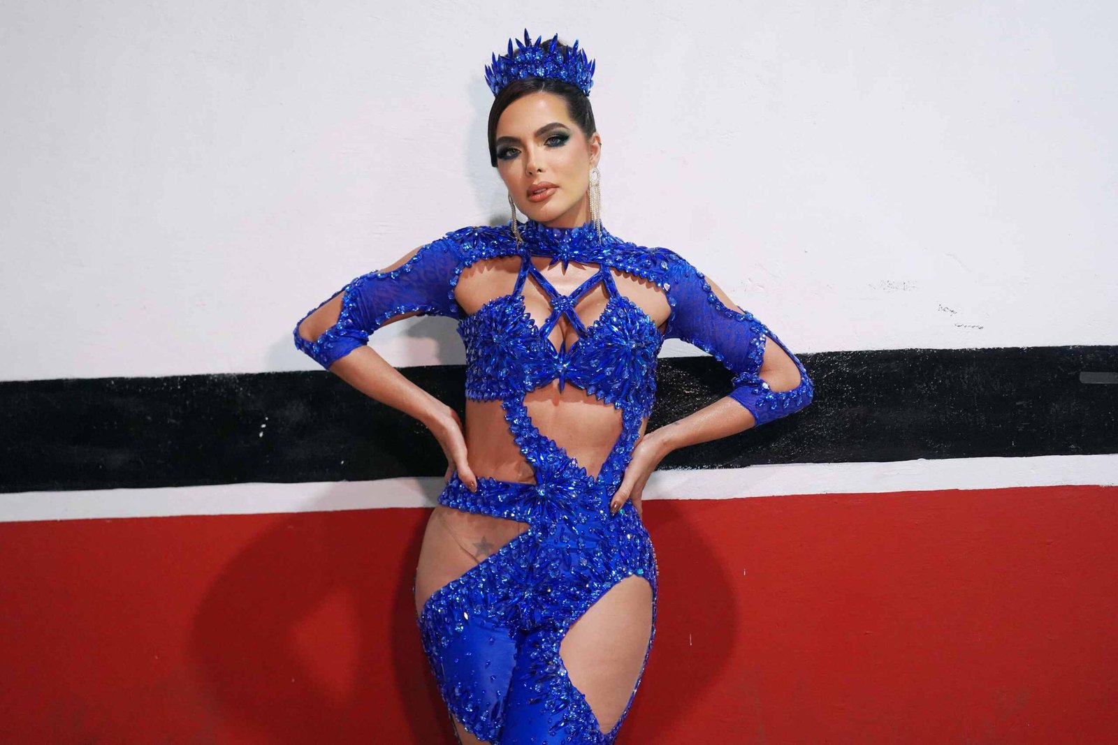 A apresentadora e sambista escolheu um look marcante para a ocasião: um macacão azul royal deslumbrante, assinado pelo estilista Luca Leme. A peça, bordada com pedrarias e franjas de strass, foi inspirada no estilo icônico da diva brasileira Anitta, destacando a elegância e sensualidade de Carla.
