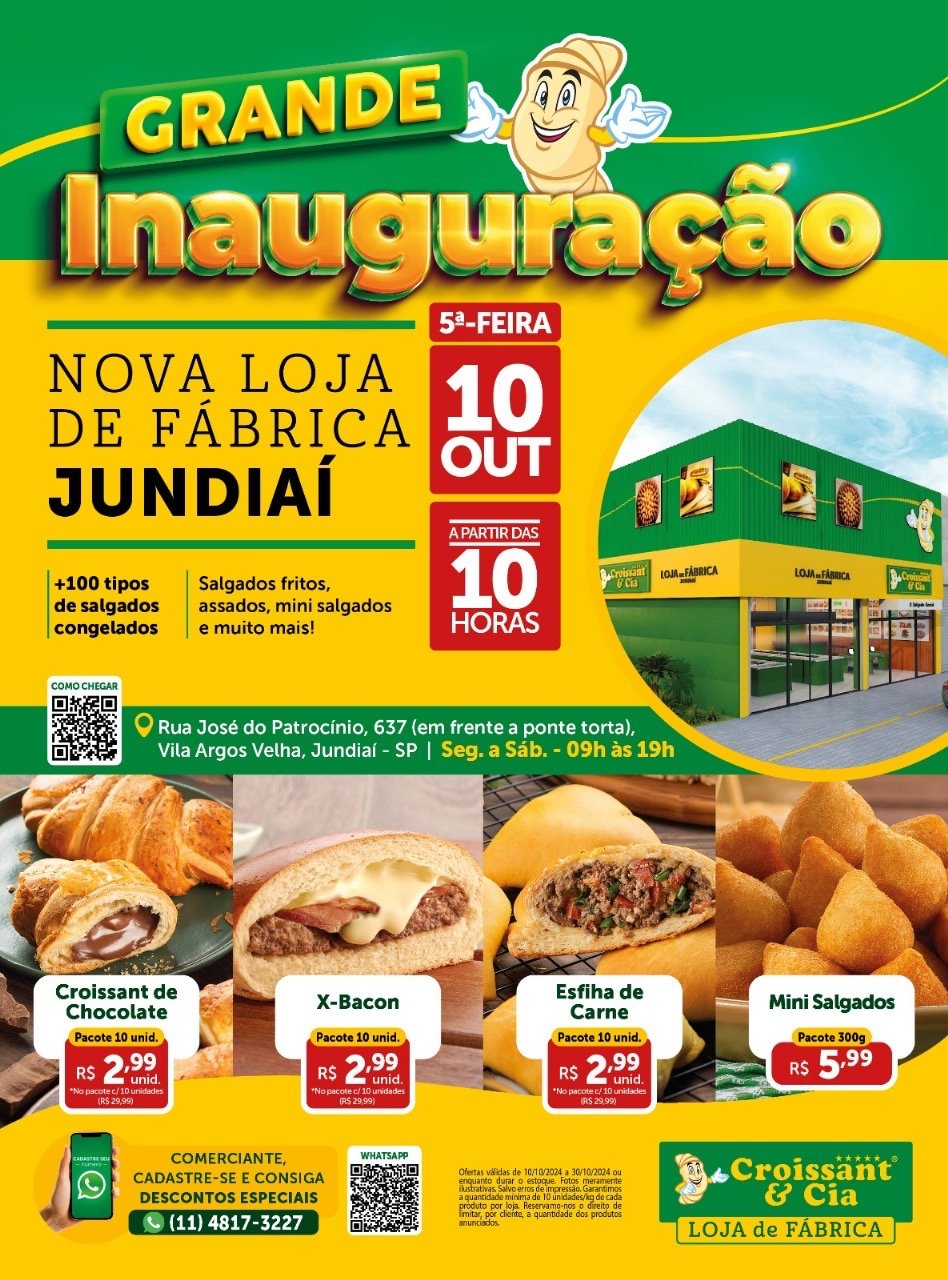 A Croissant & Cia, uma das maiores e melhores fábricas de salgados do país, vai inaugurar no dia 10 de outubro, na cidade de Jundiaí, interior do Estado de São Paulo, a sua 20ª loja. A loja de fábrica, que vai funcionar para o público de segunda a sábado das 9h às 19h, estará localizada na Rua José do Patrocínio, 637, na Vila Argos Velha (em frente a ponte torta). Com grande importância no cenário econômico do Brasil, Jundiaí já figurou entre as 11 cidades de grande poder econômico do país.