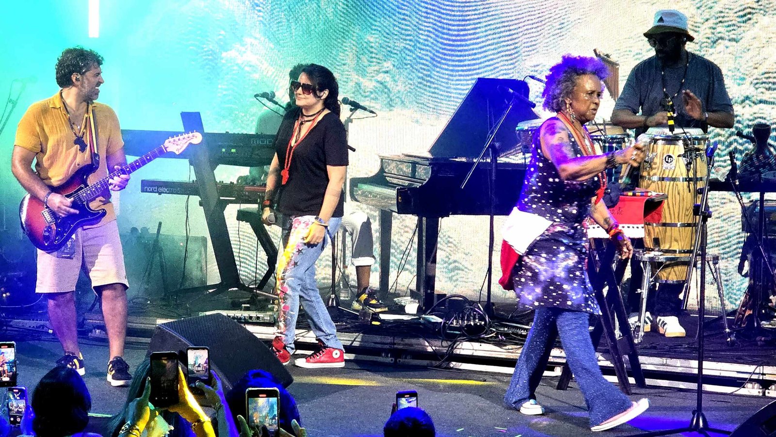 Conforme a tarde avançava, o palco principal se tornou o grande destaque do dia, com apresentações que emocionaram o público. A primeira a subir ao palco foi a icônica Sandra Sá, que, com sua energia contagiante, fez o público cantar em uníssono. O ponto alto de sua performance foi o sucesso “Olhos Coloridos”, que transformou o espetáculo em um verdadeiro coral coletivo.