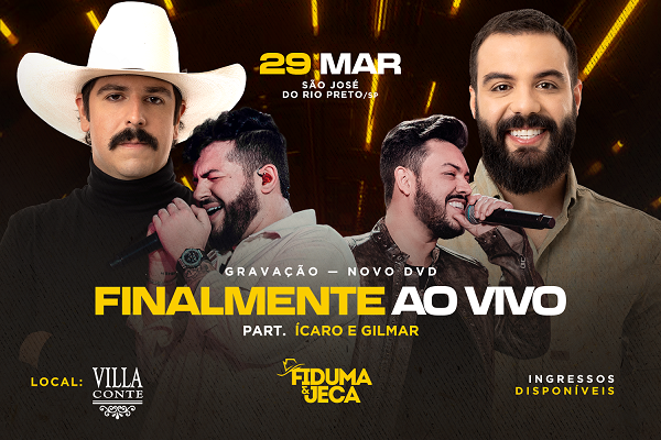 Fiduma & Jeca acaba de anunciar mais uma parceria inédita para o próximo DVD da dupla, que será gravado no dia 29 de março, em São José do Rio Preto (SP). Conhecidos por grandes releituras clássicas do sertanejo e sucessos como “M de Mulher” e “Imperfeitos”, entre outros, colecionados em pouco mais de dez anos de carreira, Ícaro & Gilmar se juntam a outros grandes nomes do sertanejo já anunciados para a festa, como Us Agroboys e Jads & Jadson.