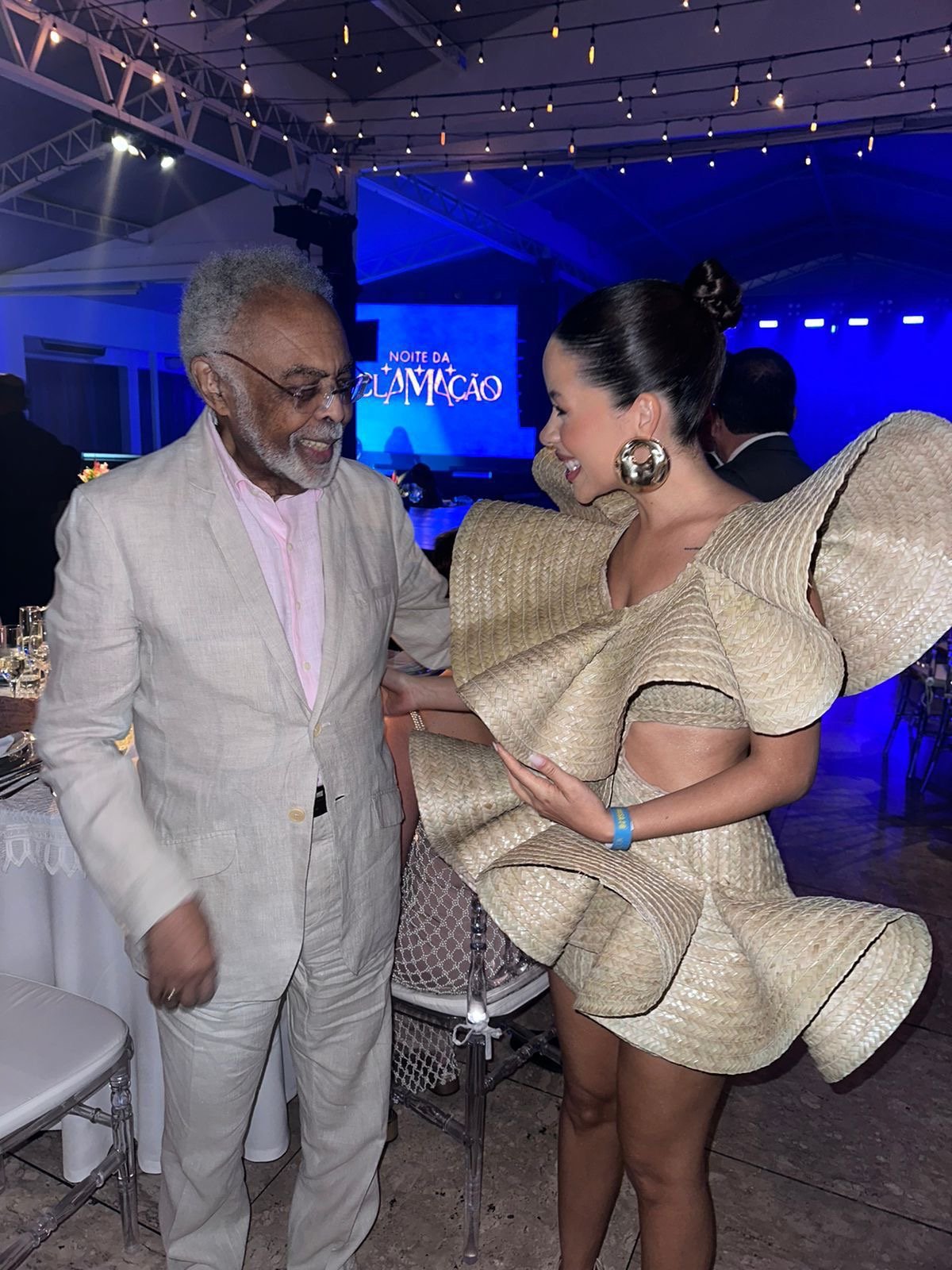 Gilberto Gil, ao ver o look de Laura, fez questão de elogiar a homenagem, destacando a beleza do conceito por trás da peça.