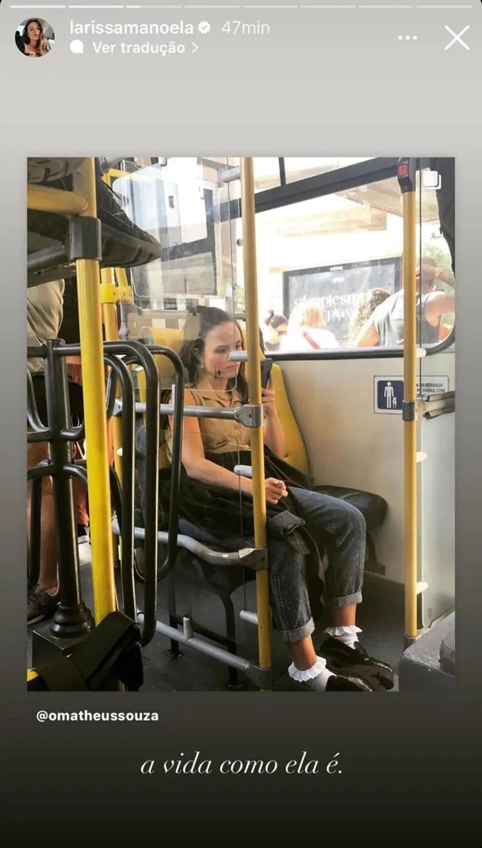 O compartilhamento da foto no transporte público, com a legenda sugestiva, levou muitos a acreditarem que Larissa estava mostrando uma parte da sua vida atual após a revelação feita em uma entrevista ao programa ‘Fantástico’. No último domingo (13), a atriz abriu o jogo sobre a briga familiar que culminou no adeus à sua fortuna.