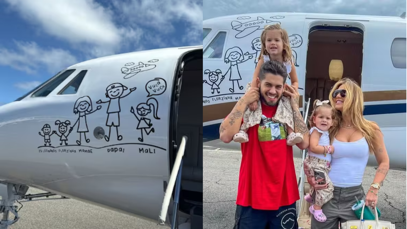As imagens, inicialmente divulgadas pela colunista Fábia Oliveira, mostram o momento em que a ilustração da família — composta por Virginia, Zé Felipe e as duas filhas do casal — é apagada de uma das aeronaves.